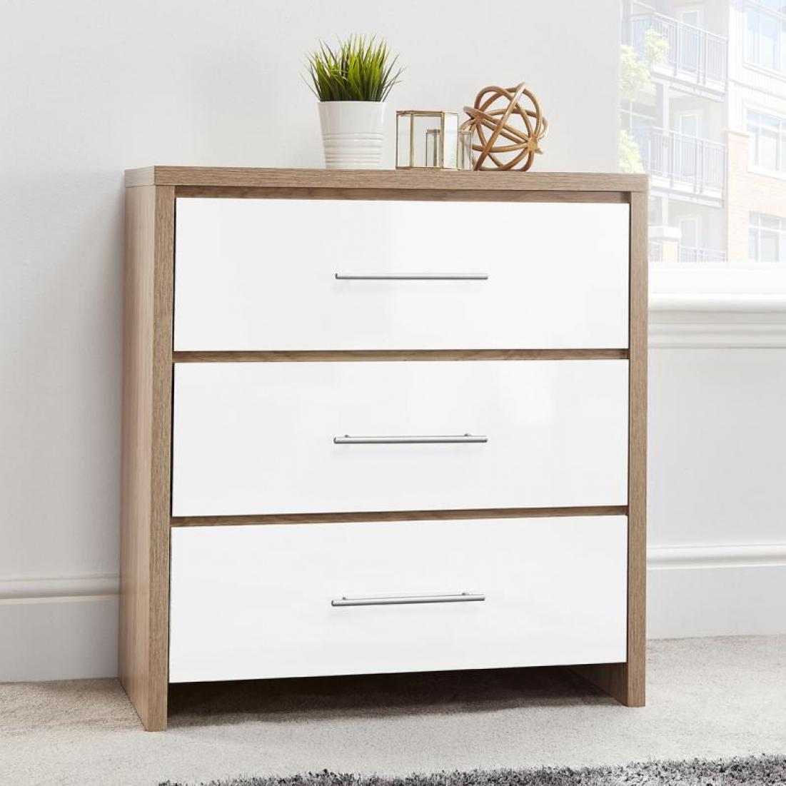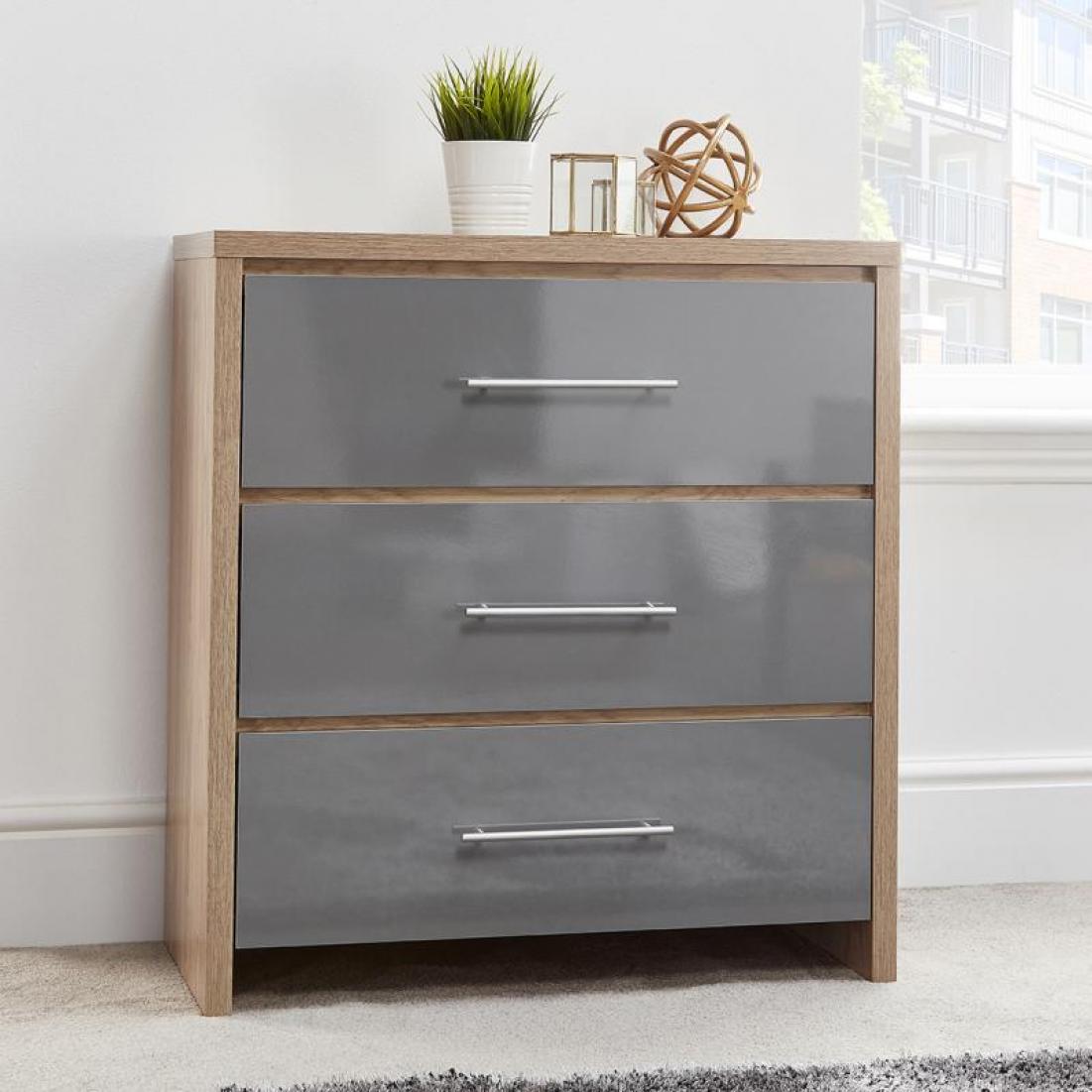 The Seville furniture range comprises of a 2 door wardrobe, 3 drawer chest and 1 drawer bedside. The Seville bedroom range is superb value for money. The outside frame is an attractive oak effect veneer while the door and drawer fronts are good quality high gloss veneer. The handles are brushed steel and the drawer runners and fittings are metal.