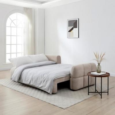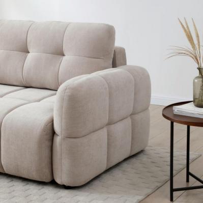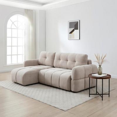 Description: A brand-new quilted corner sofabed with a lovely curved profile and plump seating. It includes shallow storage under the seat for pillows or extra bedding and easily converts into a comfortable sleeping area. Designed to create a low, loungy feel with enveloping comfort, the piece is fully upholstered in soft taupe chenille fabric.