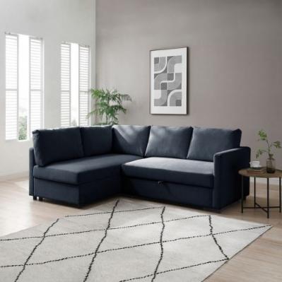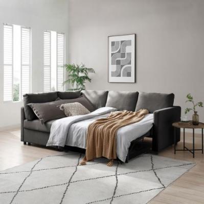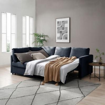 Description: The Clara Sofabed is a modern corner sofabed with a pop-up mechanism that easily converts into a full king-size bed. Featuring clean lines, low black feet, and a minimalist design, it offers comfortable seating, a plush backrest, and handy storage beneath the chaise for added practicality.