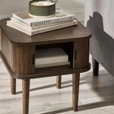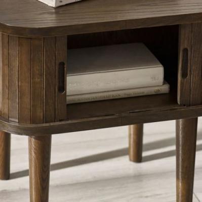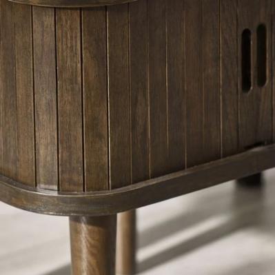 Description: Elevate your space with the Arya Side Table, featuring a rich dark oak finish and slatted tambour doors that reveal hidden storage. Set on Nordic-inspired tapered legs, it’s a sleek and versatile piece for any room.