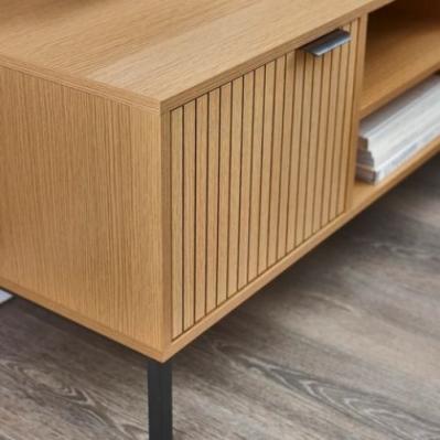 Description: Revamp your living space with the Sia Media Unit, combining style and function. Featuring slatted-effect doors, spacious cabinets, and an open centre shelf, it keeps your media and décor neatly organised. Finished with sleek metal legs, it brings a clean, modern look to any room.