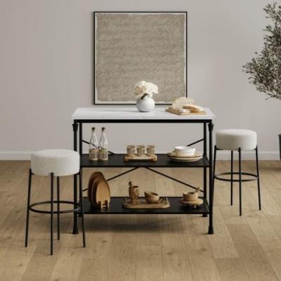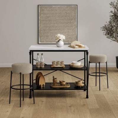 Description: The Anais Counter Stool features luxurious boucle fabric paired with contrasting metal legs for a sleek, modern look. Its thick padded seat ensures comfort, while its compact design allows it to store easily under a countertop.