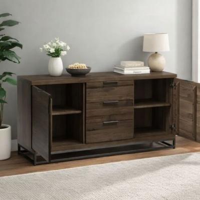 Description: Made from solid oak, this Sideboard offers a rustic dark oak finish emphasising the stunning natural wood grain. The Brooklyn Sideboard offers a vintage edge featuring industrial style metal legs. Featuring two spacious cupboards with shelves, and three drawers, this sideboard is perfect for a wide range of modern decor.